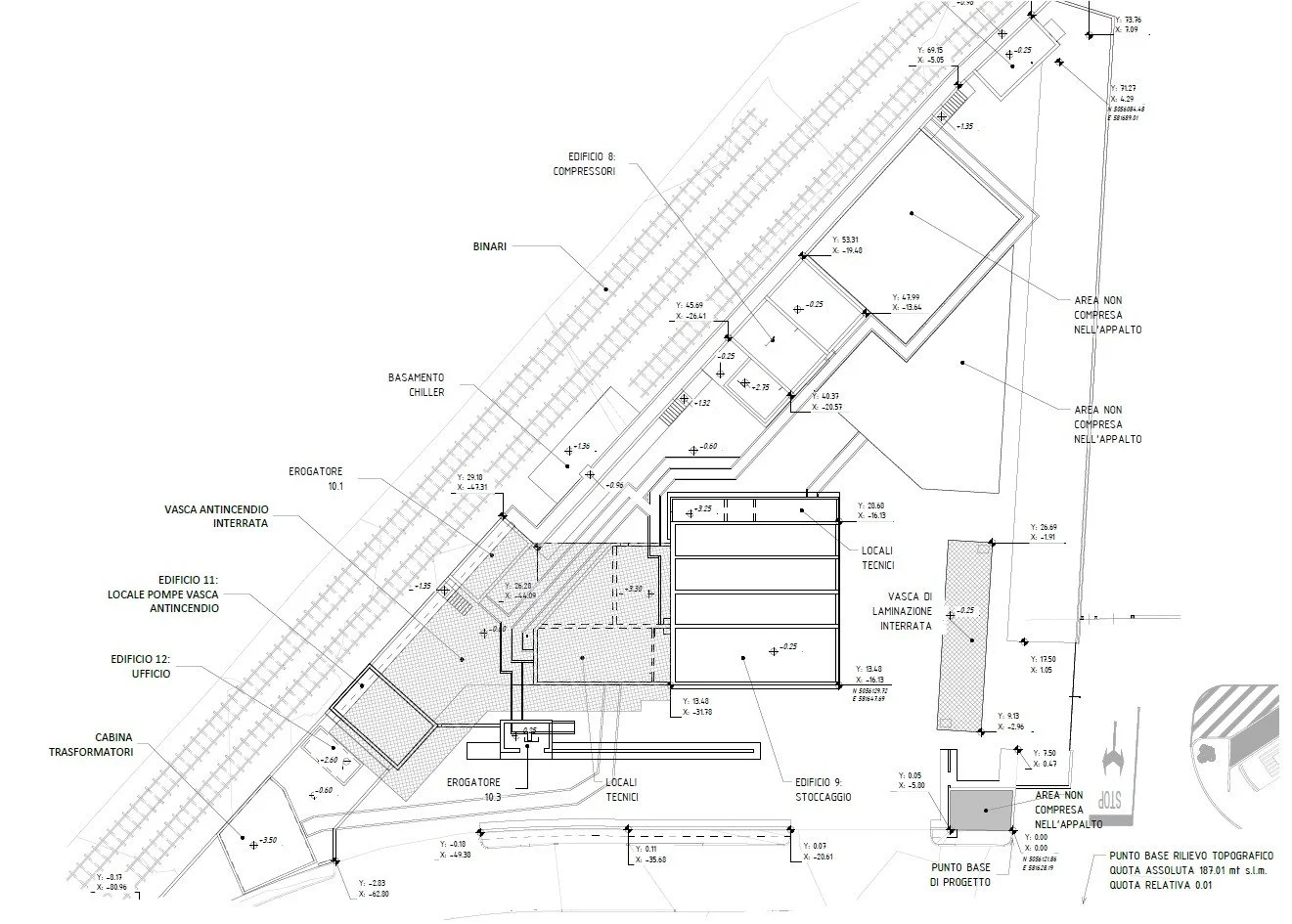 Sono state progettate le strutture in calcestruzzo armato della vasca antincendio (650m³), del locale pompe a servizio del presidio dei Vigili del Fuoco, del locale compressori e del locale di stoccaggio, tutti componenti essenziali per la sicurezza e l’operatività dell’infrastruttura. L’incarico ha incluso inoltre la progettazione strutturale dei cunicoli per il passaggio dei sotto-impianti, dei cunicoli fognari, nonché di una vasca di laminazione, elementi fondamentali per la gestione delle acque e per il corretto funzionamento dell’impianto.