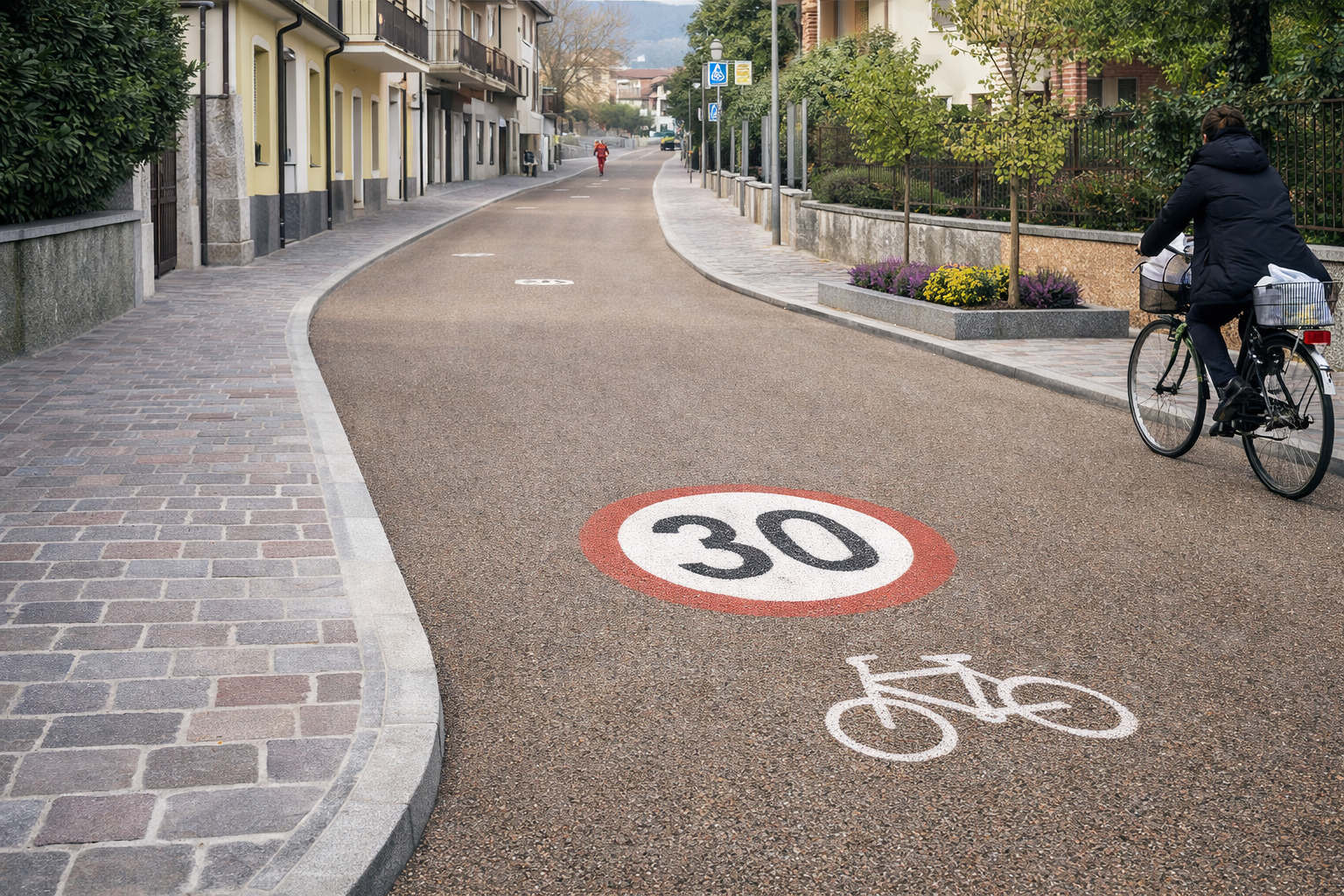 Elemento cardine dell’intervento è la realizzazione di una zona a traffico calmierato “AREA 30” di circa 125 m, caratterizzata da una nuova organizzazione della carreggiata e degli spazi di sosta, con pavimentazioni drenanti e fonoassorbenti in asfalto ecologico e marciapiedi in cubetti di porfido 6/8 cm, posati ad archi contrastati, in coerenza con le sistemazioni esistenti.