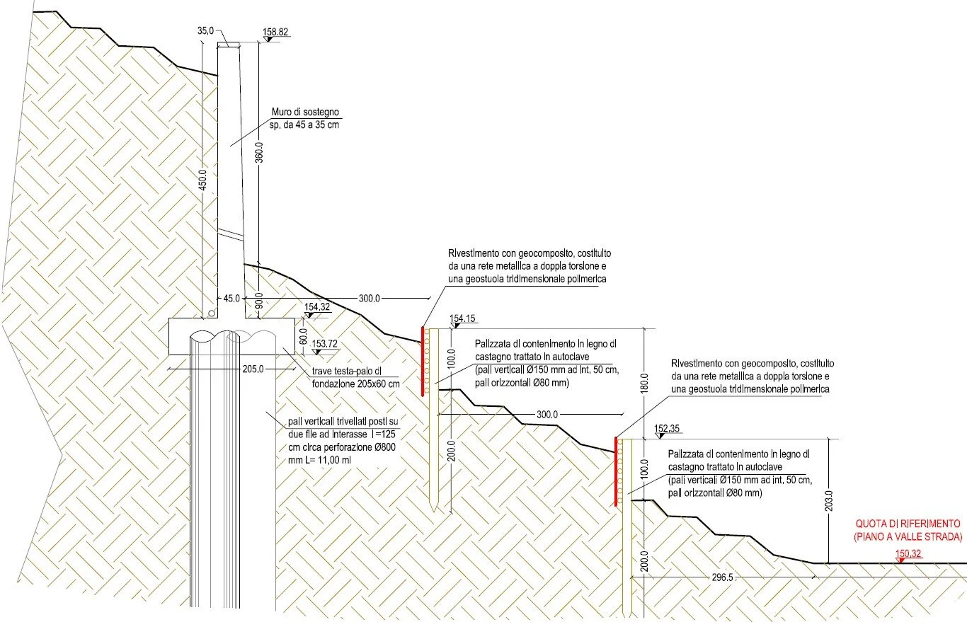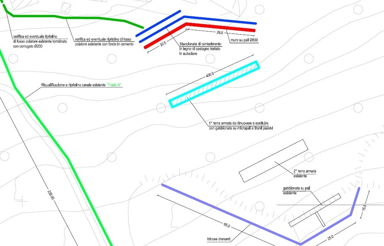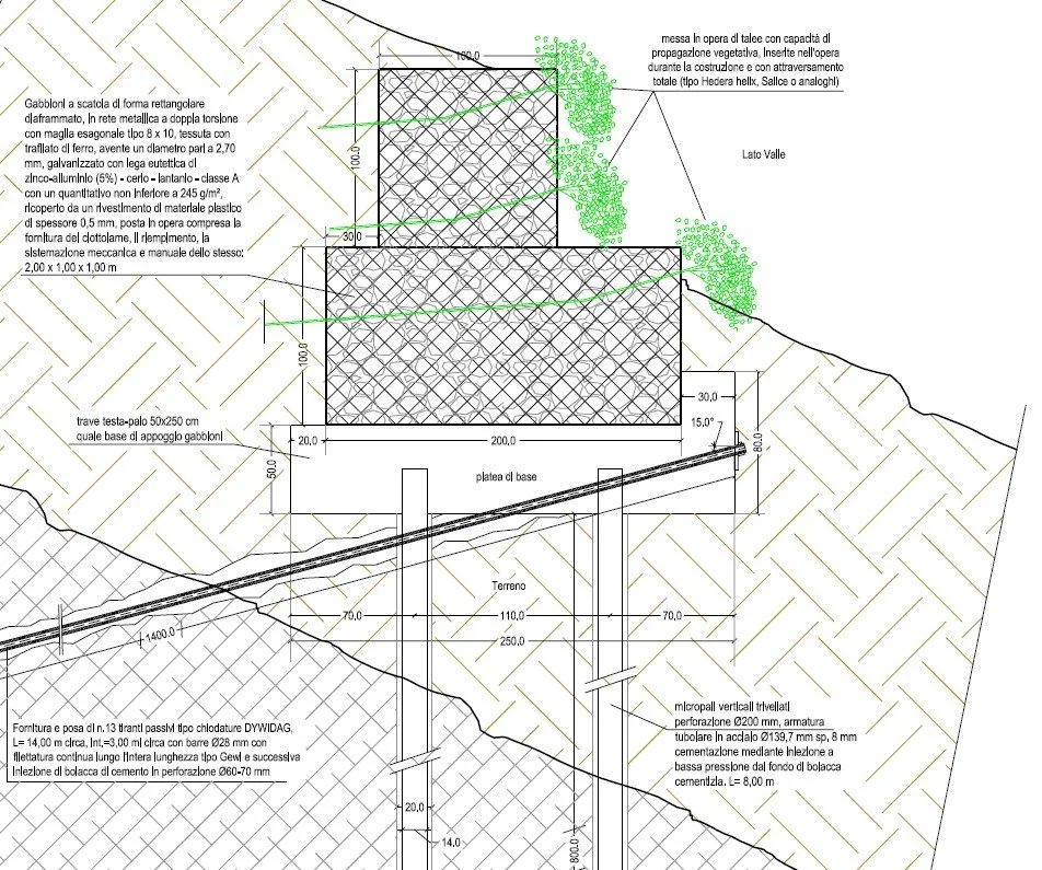 Il progetto esecutivo prevede un insieme coordinato di opere strutturali, idrauliche e di mitigazione ambientale, finalizzate al consolidamento del versante e alla regimazione delle acque, assicurando la durabilità e l’efficacia degli interventi nel tempo.