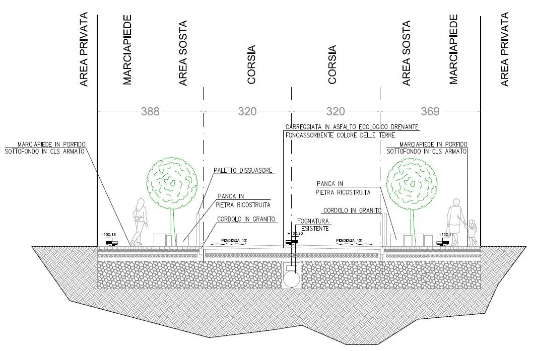 La soluzione progettuale ha privilegiato l’impiego di tecnologie innovative, garantendo elevata resistenza meccanica, gestione sostenibile delle acque meteoriche e riduzione dell’impatto acustico. Le restanti porzioni di via sono state mantenute con limite di velocità pari a 50 km/h, con adeguamento dei marciapiedi ai criteri di accessibilità e superamento delle barriere architettoniche, oltre alla riorganizzazione delle alberature e all’inserimento di nuove aree di sosta e arredo urbano.